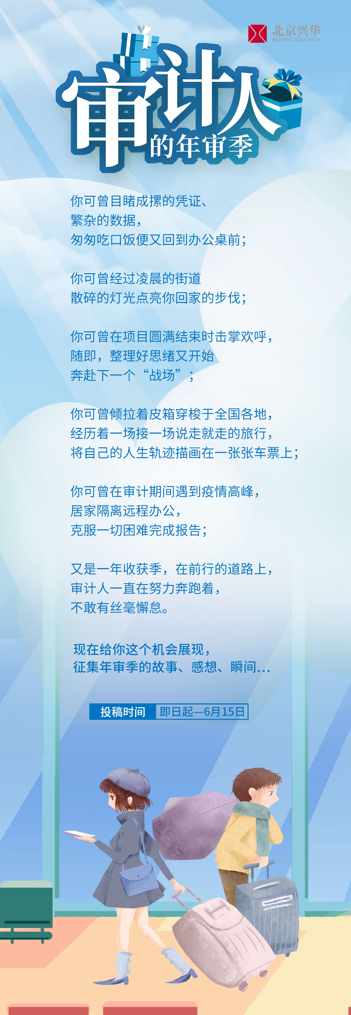 2、收到投稿后我们将按照顺序将作品逐步上传至北京兴华视频号,投票期截止后将按照点赞量排序, 获胜作品个人、团队将获得兴华专属审计人、审计团队神秘大奖奖励。