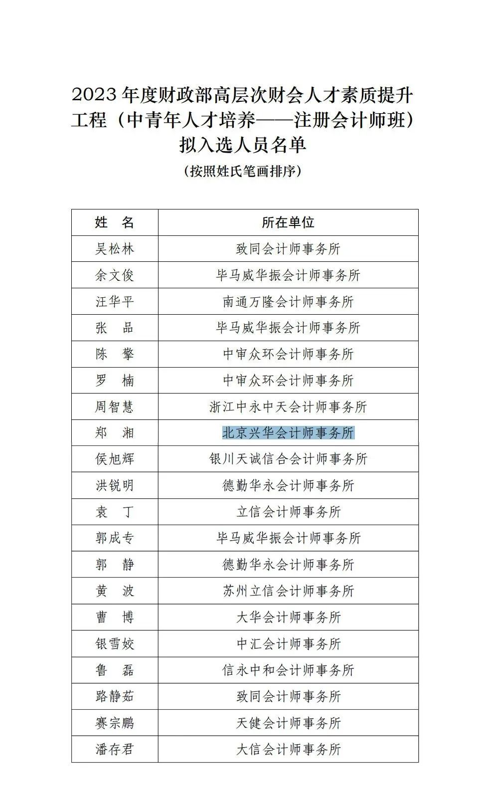 北京兴华高级合伙人郑湘入选2023年度财政部高层次财会人才素质提升工程