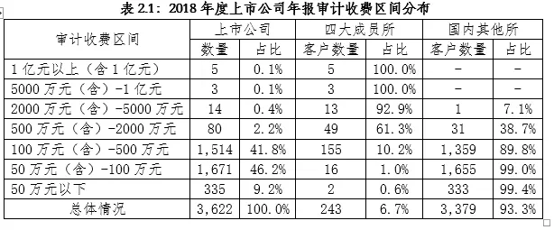 审计收费在一定程度上反映年报审计市场的竞争状况。从年报审计收费区间看,审计收费在2,000万元以上的上市公司共22家,主要分布在金融、能源和建筑等行业,21家为四大成员所的客户。在500万元(含)至2,000万元的审计收费区间内,四大成员所与国内其他所相比仍具备较大优势。在100万元以下的审计收费区间内,四大成员所涉足较少,基本由国内其他所承做。2018年度上市公司审计收费区间分布如下表所示。