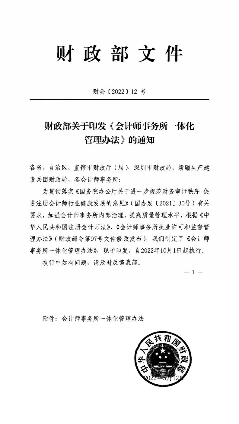 第一条 为了提高会计师事务所一体化管理水平,强化内部治理,促进审计质量提升,根据《中华人民共和国注册会计师法》、《会计师事务所执业许可和监督管理办法》(财政部令第97号文件修改发布),制定本办法。
