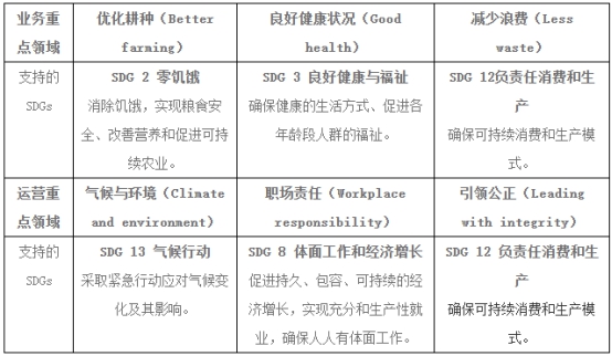 作为全球性企业,K公司积极响应联合国可持续发展目标SDGs(请参见附录A),并基于其业务特点,结合其公司战略目标,以优化耕种(Better farming)、良好健康状况(Good health)、减少浪费(Less waste)、气候与环境(Climate and environment)、职场责任(Workplace responsibility)及引领公正(Leading with integrity)6个方向作为其可持续发展工作的重点领域,重点支持SDG 2、3、8、12、13。其中,优化耕种、良好健康状况及减少浪费是业务方面的可持续发展重点领域,气候与环境、职场责任、引领公正为运营方面的可持续发展重点领域。